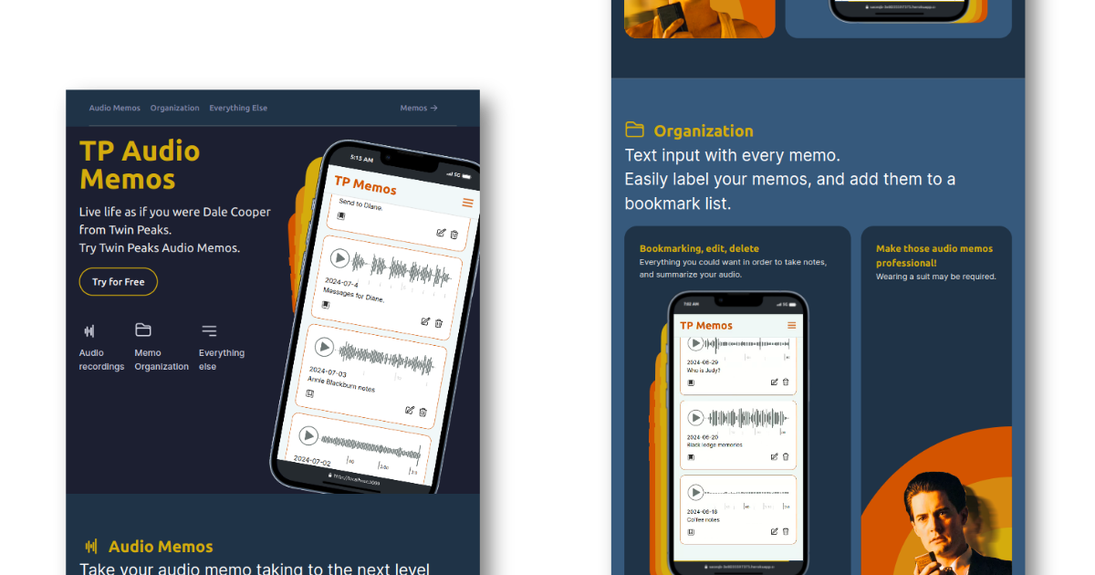 Recently I took elements from two freelance jobs I had finished and used them to create a new demo project. I ended up creating TP Audio Memos, which is a Twin Peaks-inspired audio memo-taking web app. One of the more difficult things - near impossible maybe - I encounter when approaching web design is starting with a blank canvas. Without some kind of framework for the design it can become very difficult to come up with a convincing, professional looking website. However, even though I have no background in design, other than what I have taught myself through following general principles, the freecodecamp web design course</a>, and my sense of what looks right, I think I have started to come up with some original web designs.